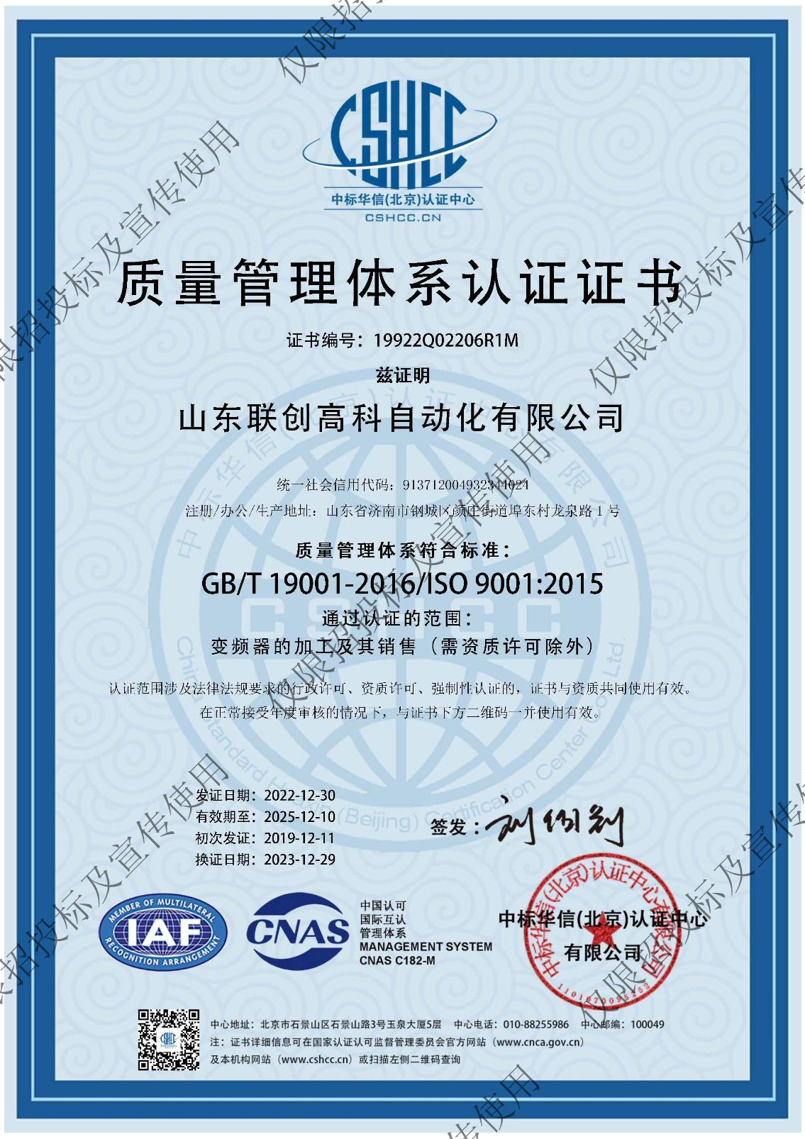 质量管理体系认证证书